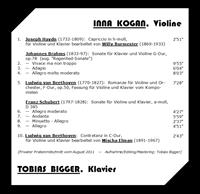 > Godowsky, Godowsky/Heifetz, Weiner, Moszkowski/Scharwenka, Wolf/Mostras, Corelli, Mozart/Kreisler, Schubert/Mostras, Paganini/Kreisler, Medtner und Scott
